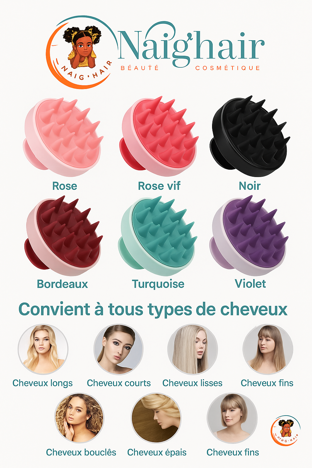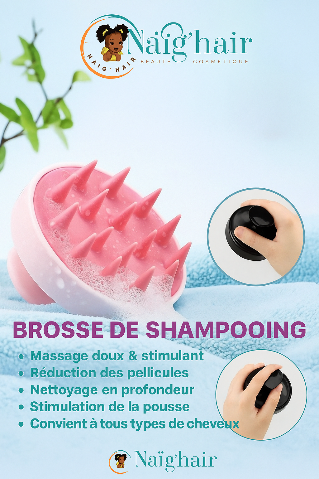 La Brosse de Shampoing Naïg’hair est un outil de soin indispensable pour tout type de cheveux. Que vous cherchiez à apaiser un cuir chevelu sensible, mieux nettoyer vos cheveux ou simplement améliorer votre routine capillaire, cette brosse est votre alliée idéale. Facile à utiliser et durable grâce à son silicone résistant, elle deviendra rapidement un incontournable dans vos rituels de soin. Donnez à vos cheveux et à votre cuir chevelu l’attention qu’ils méritent.